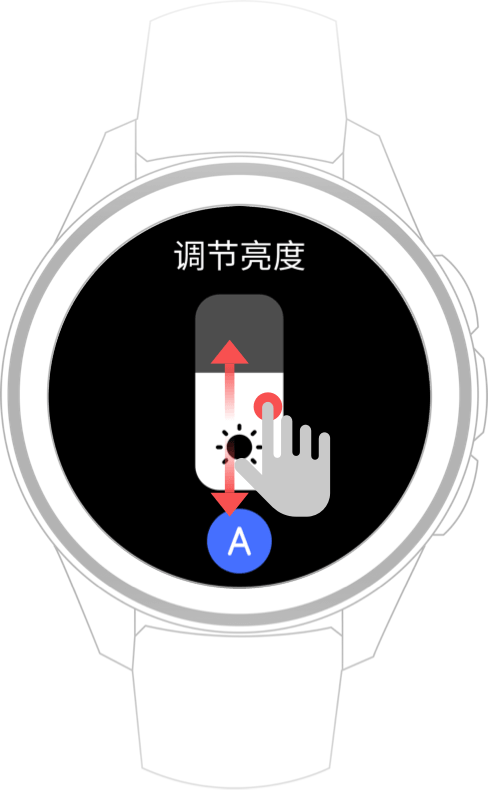 在手表表盘界面单击上键进入应用列表,上下滑动屏幕,进入“设置” > “屏幕显示” > “调节亮度”,可根据需要设置屏幕亮度,默认设置为自动(根据外界环境光调节手表的亮度)。点击取消自动调节后,可上下滑动进行手动调节。
